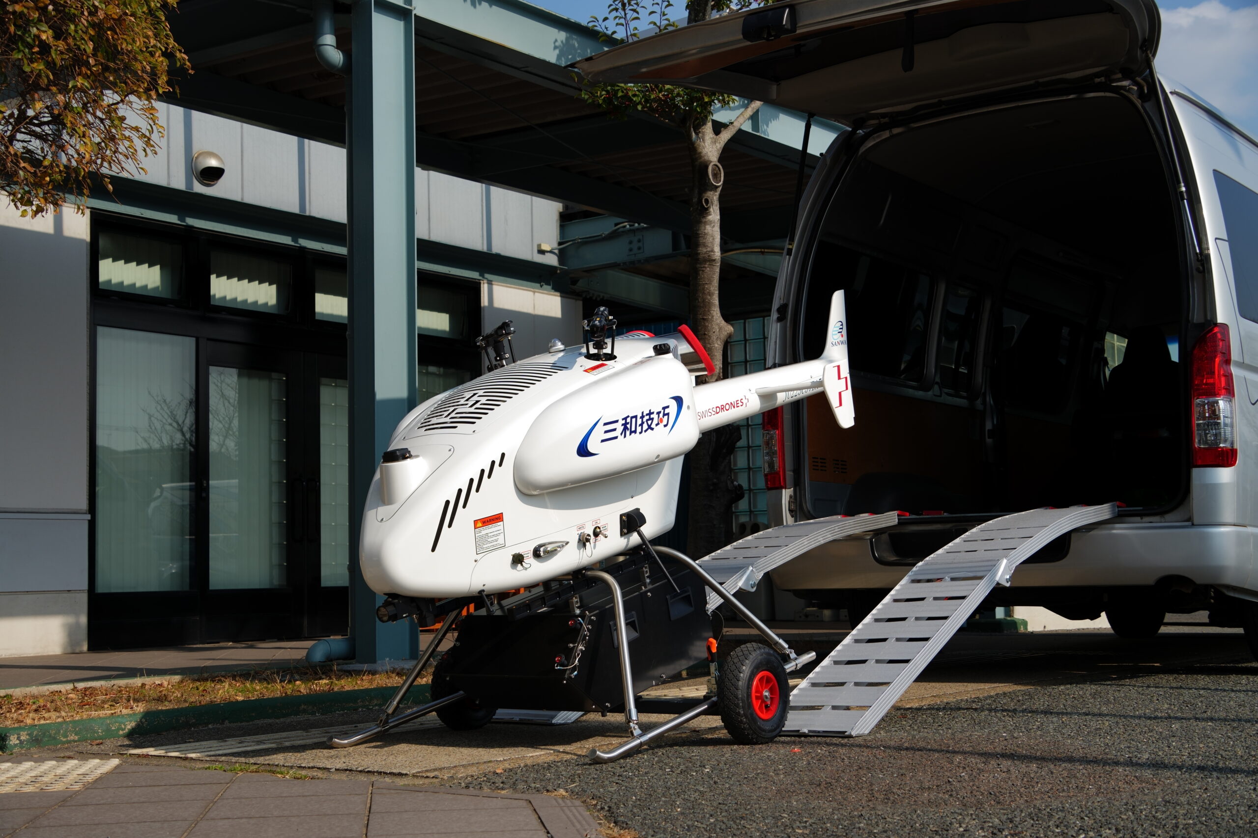 機体はバンで輸送が可能で、任意の場所を離着陸地点にすることが可能です。